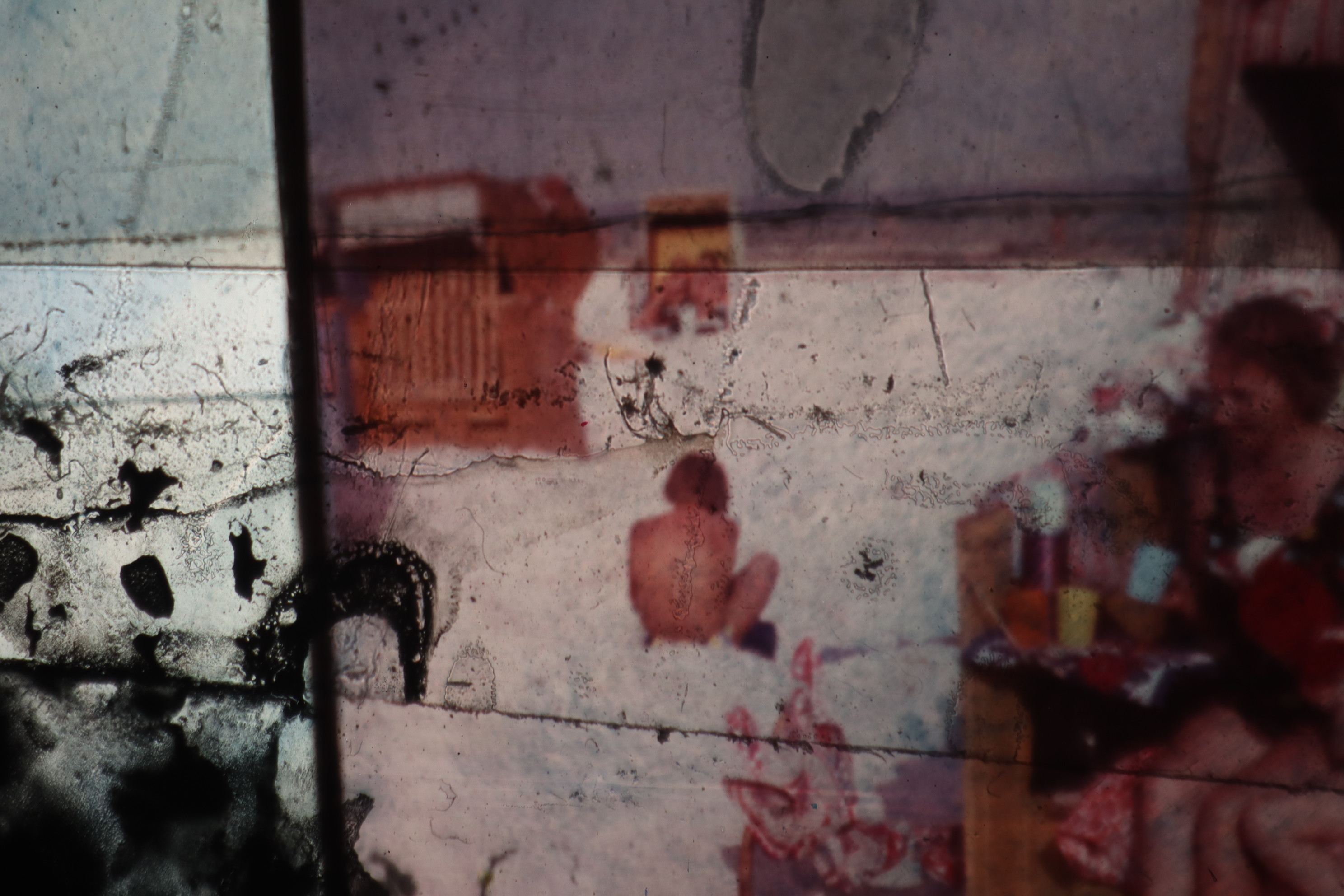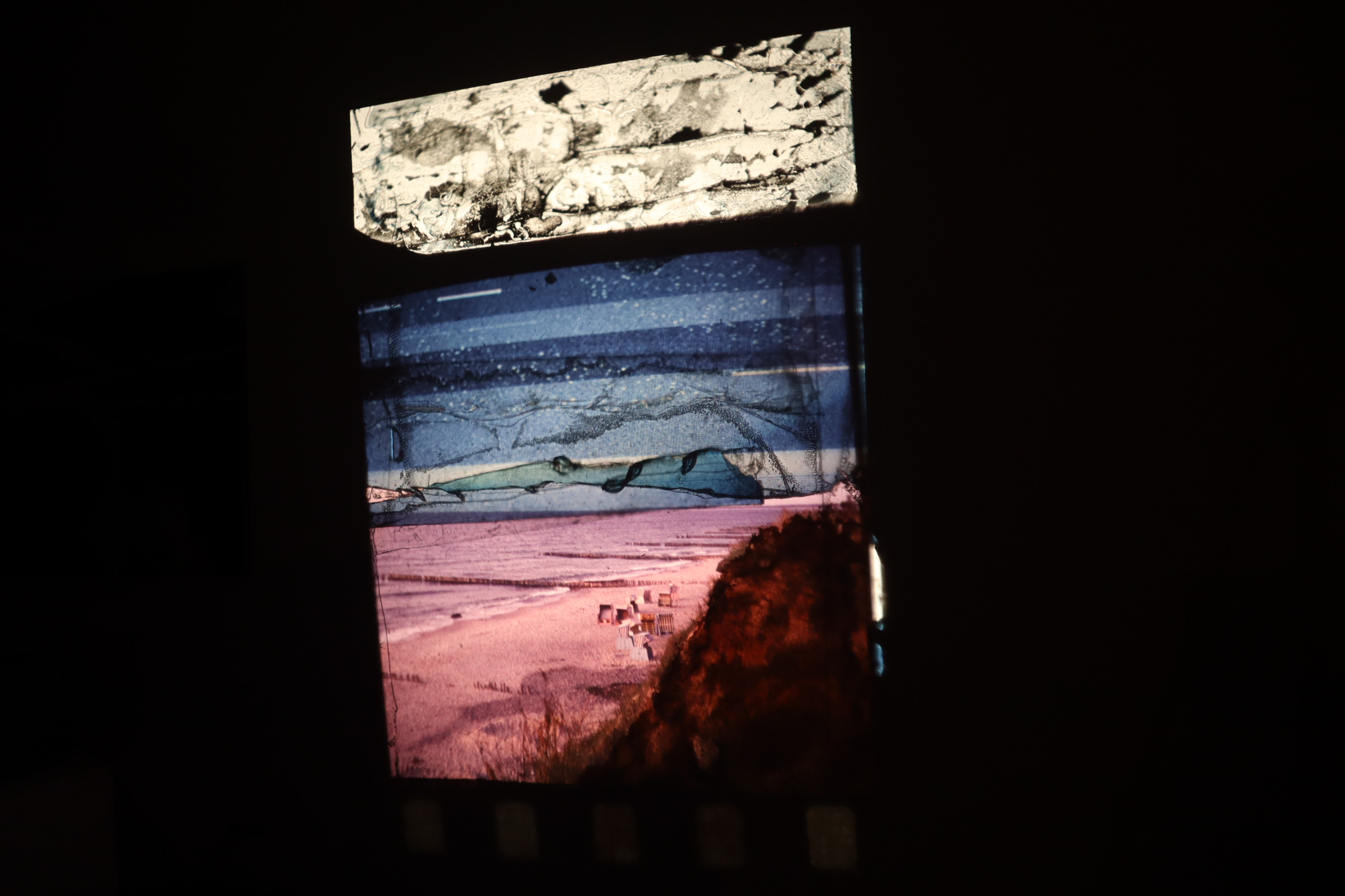 Untethered Memories is very much a work in progress. For now, it is an ongoing series of micro-collages/compositions made with found slide film, scotch tape, watercolour and my own slide photography, often of television static or other sorts of interference.
